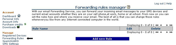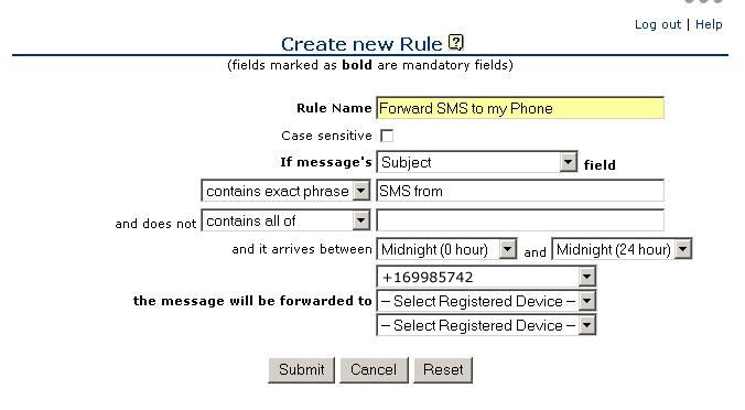 The rule you need to create will tell our service to send your incoming SMS, which automatically arrive in your inbox, to go to your mobile phone. This phone must be one of your registered devices.